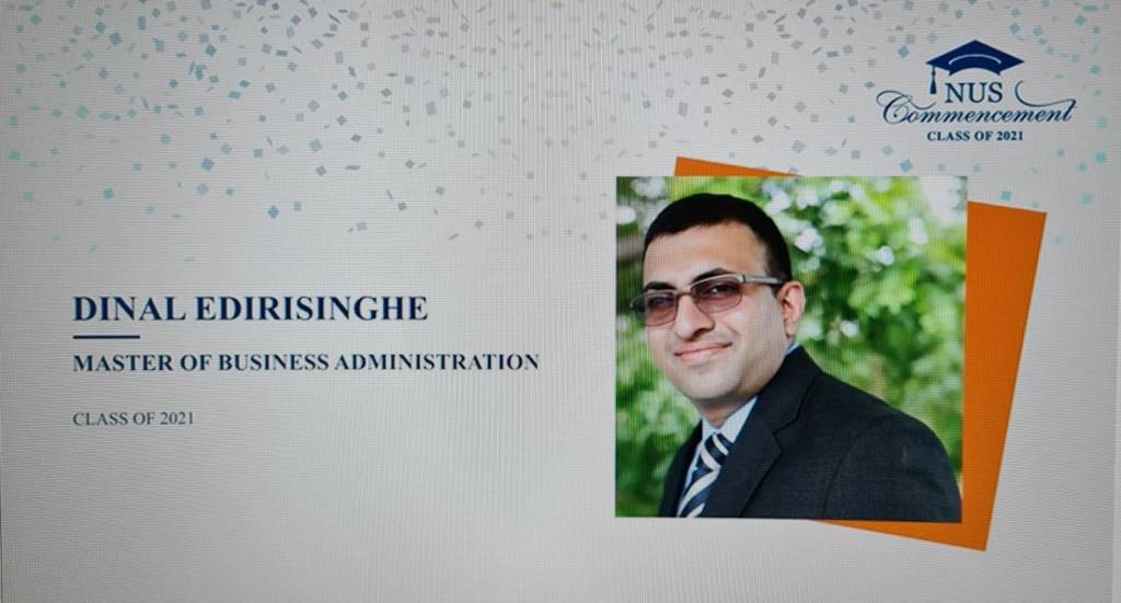 I graduated with a NUS MBA on 2nd July 2021. I would like to dedicate this post graduate degree to my mother, father and Business Mentor Mr Chandra Jayaratne. All three of them would often ask me when I plan to complete my MBA. In July 2018 with 11 years of work experience, I began applying to 12 MBA programs in Singapore, the United Kingdom and Australia. I received six offers with financial aid and chose the highest ranked university as per the Global MBA Rankings by the Financial Times in 2019 – National University of Singapore better known as NUS.